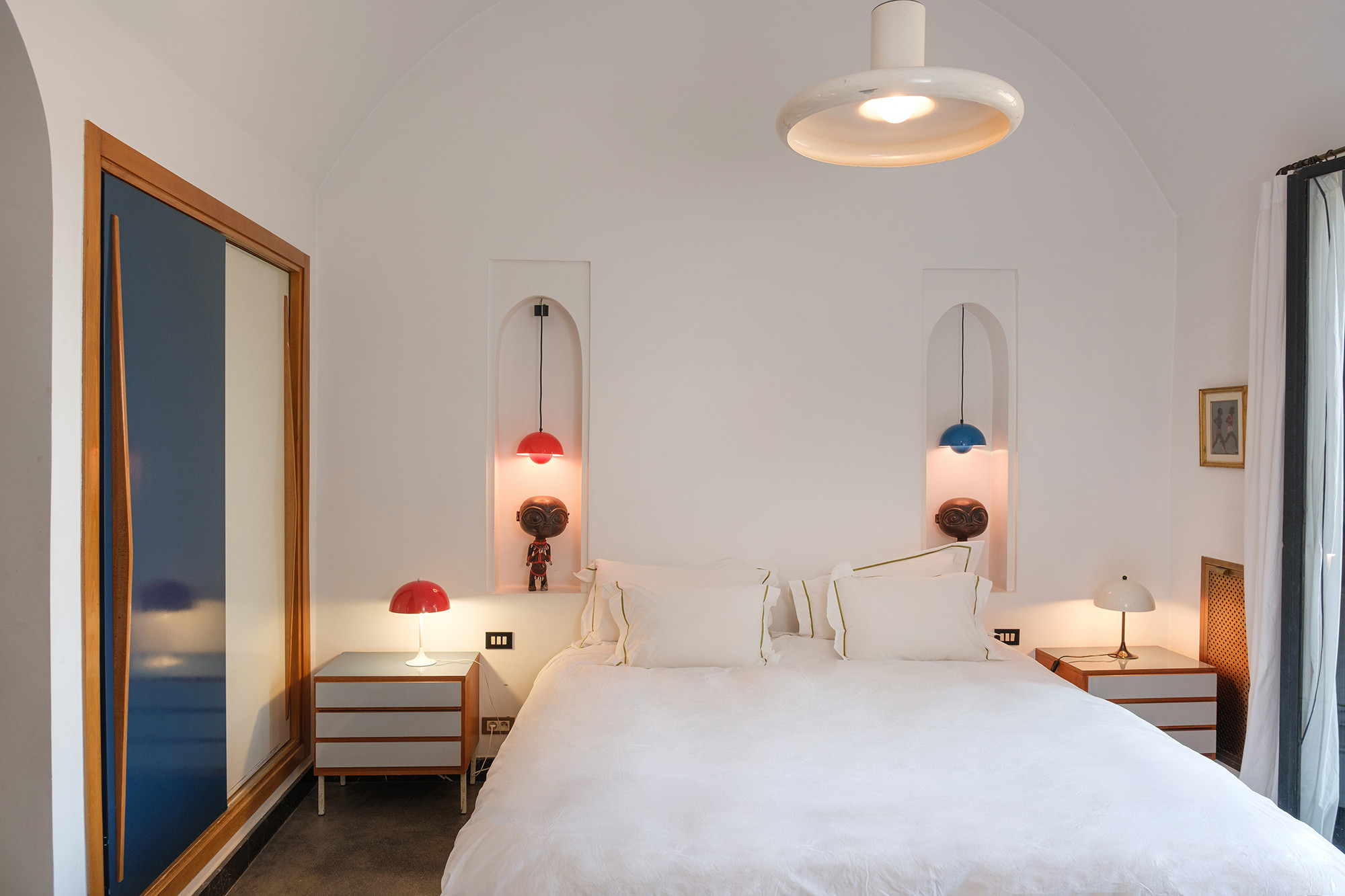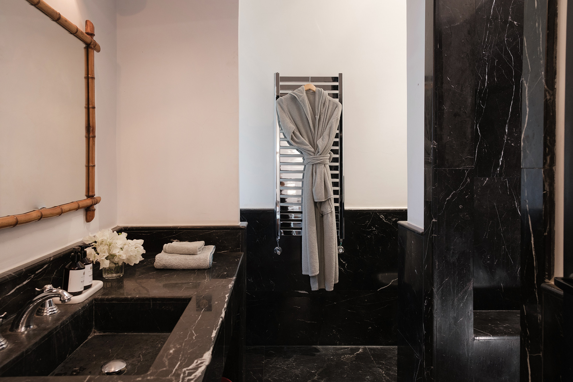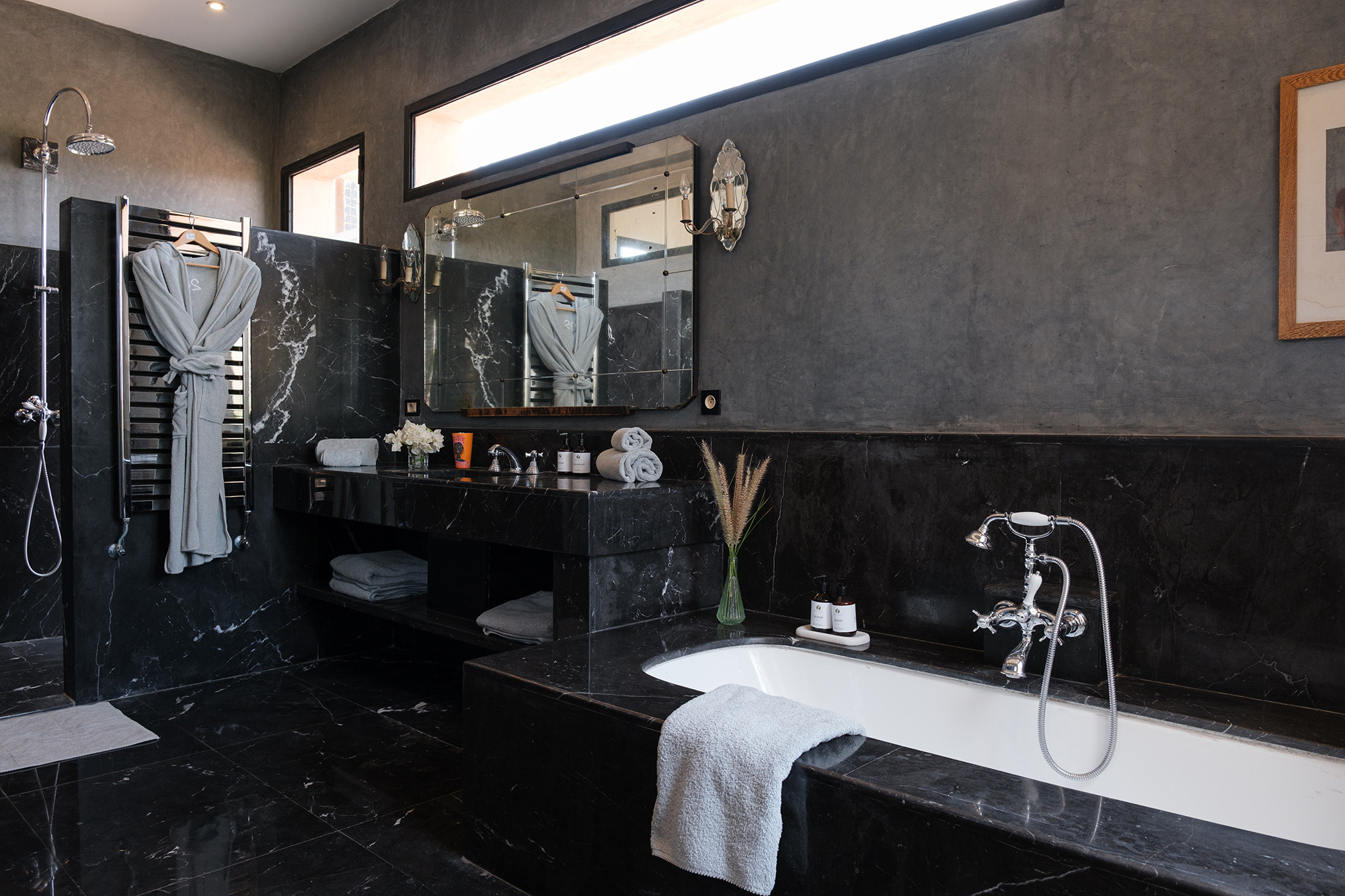• 6 chambres, chacune avec lit kingsize et salle de bain privative, pensées comme des suites d’hôtel, rangements généreux et beaux luminaires.