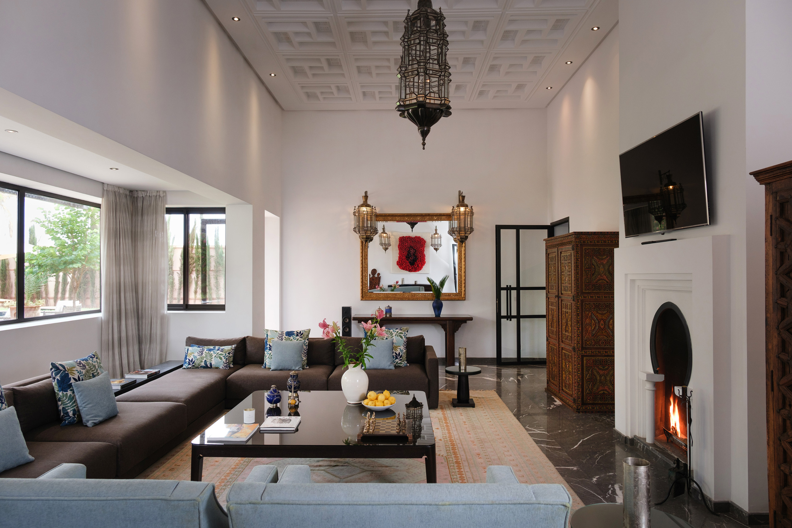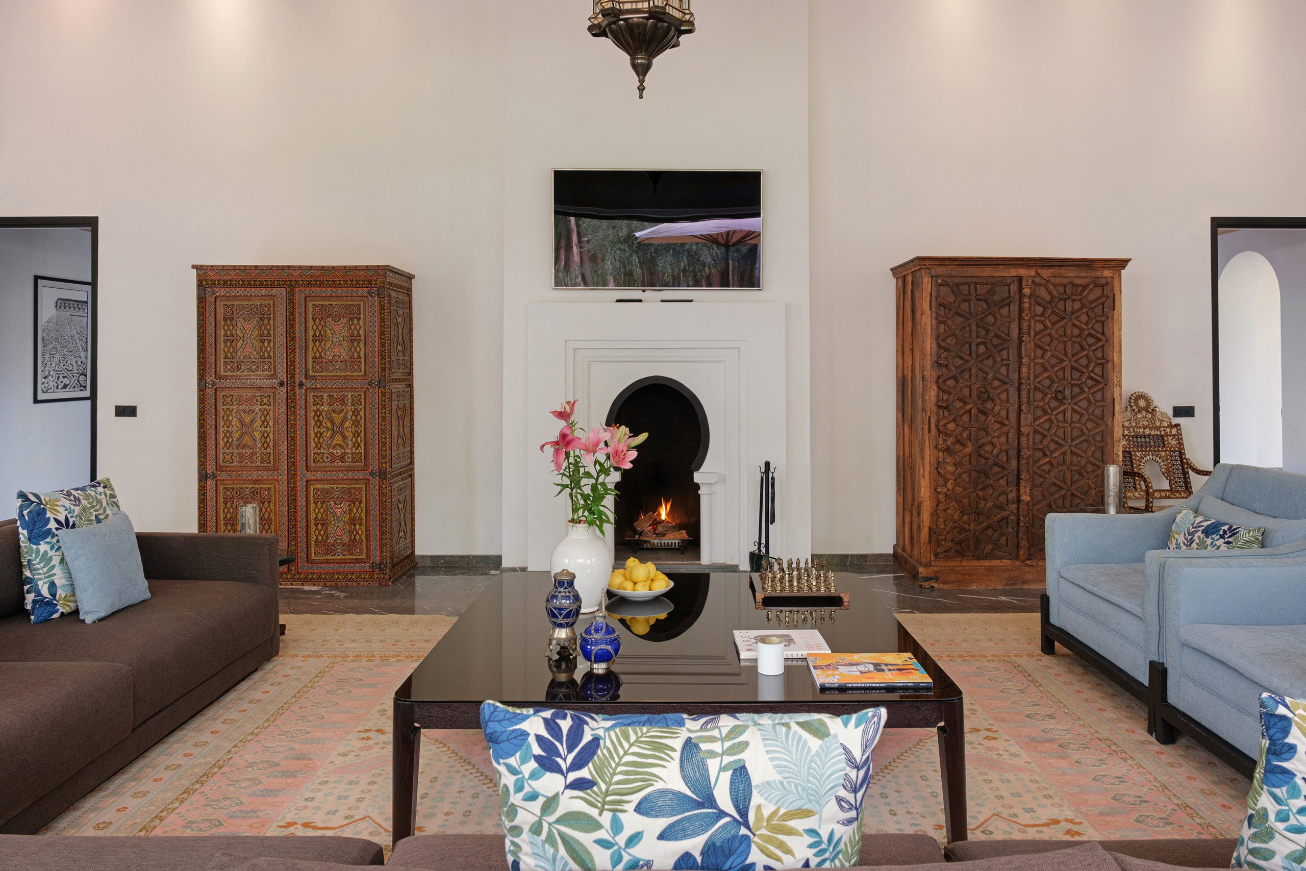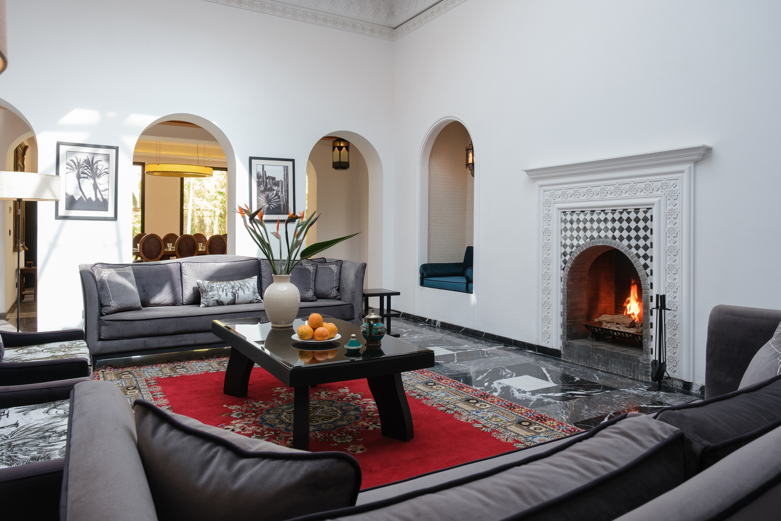 Le bâtiment principal abrite deux salons : un espace lumineux avec canapés blancs et hauts plafonds, et un second avec cheminée et TV curve. Salle à manger intérieure, coin petit déjeuner, bibliothèque, objets chinés au fil des années — Villa Yasira a tout d’une grande maison de famille.