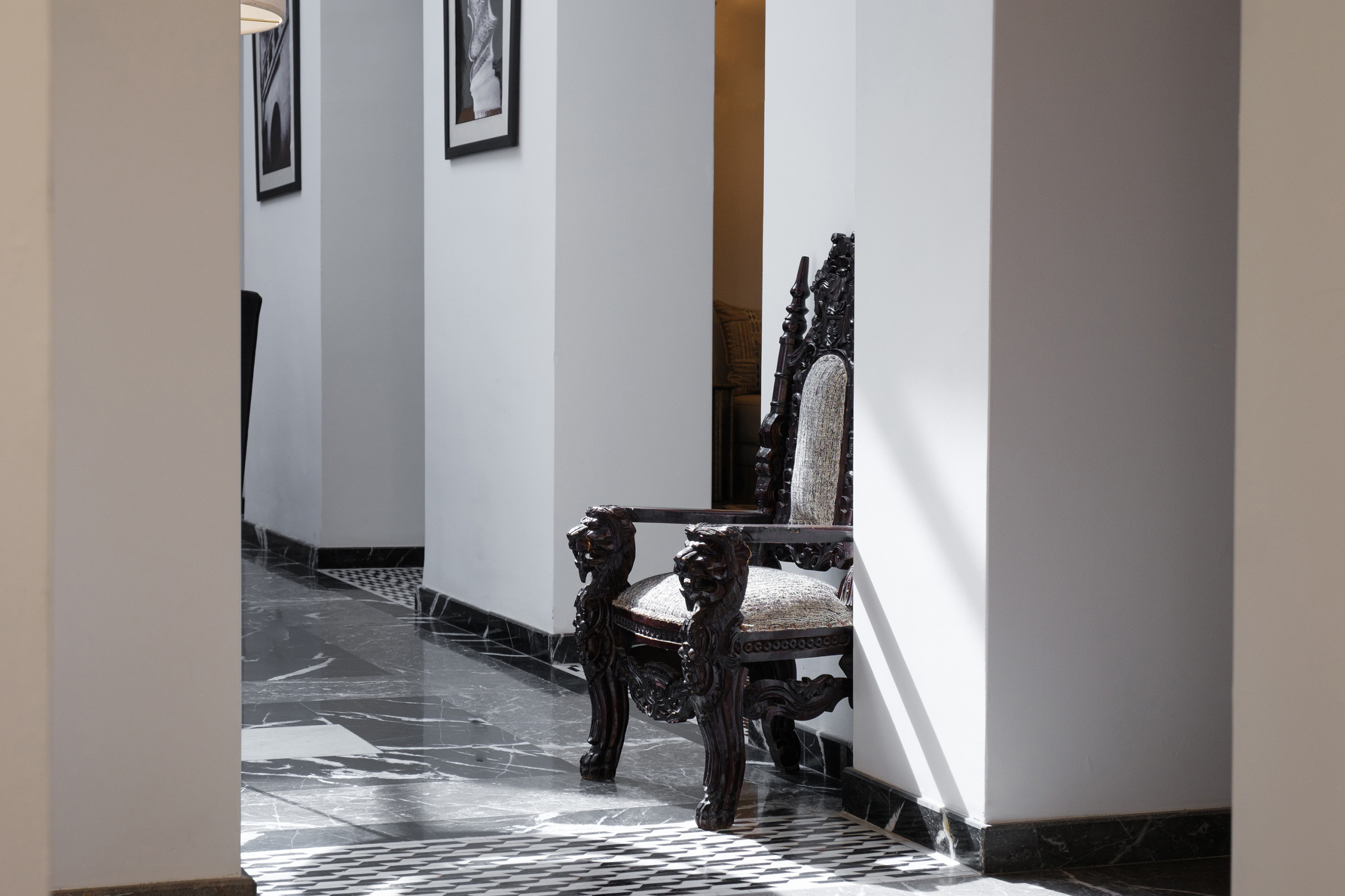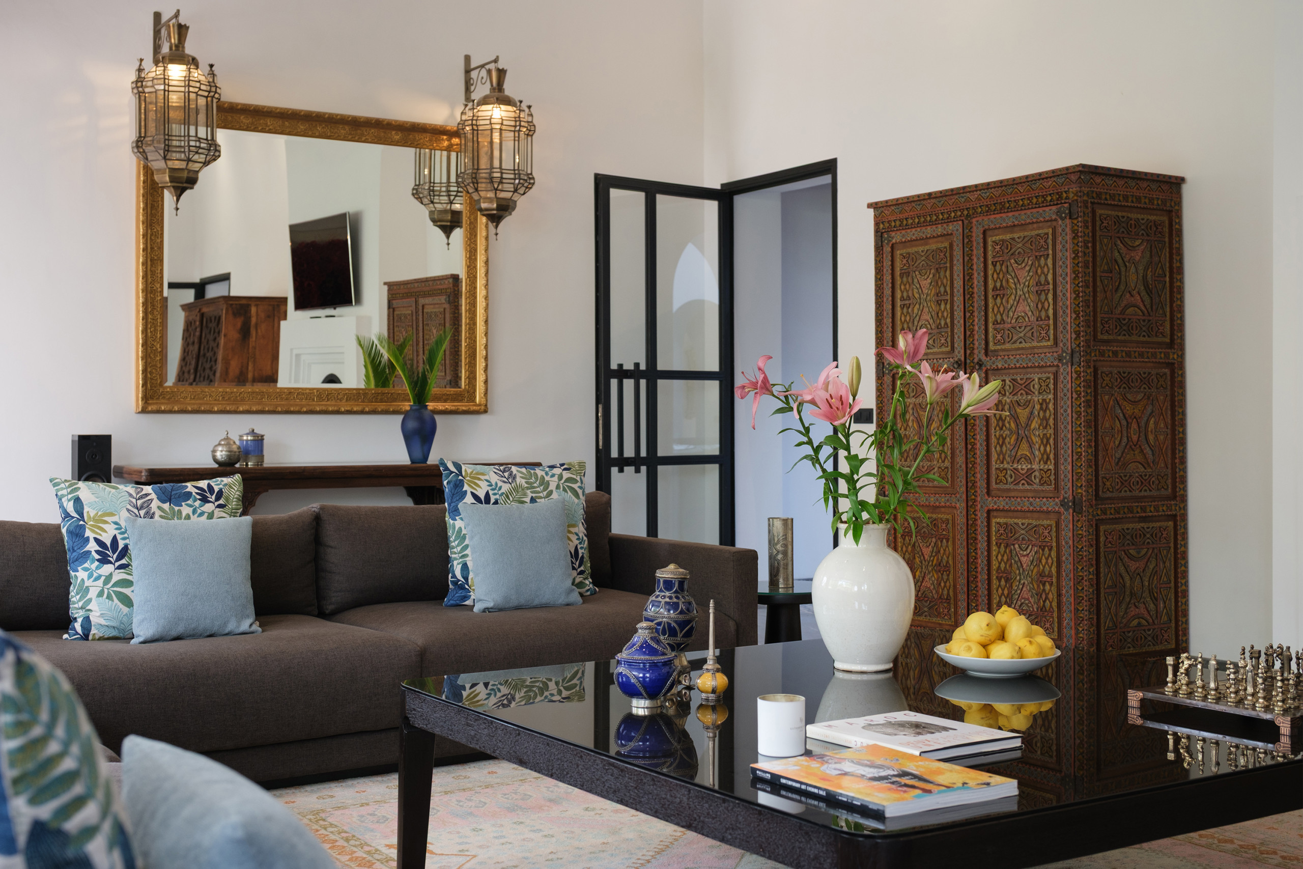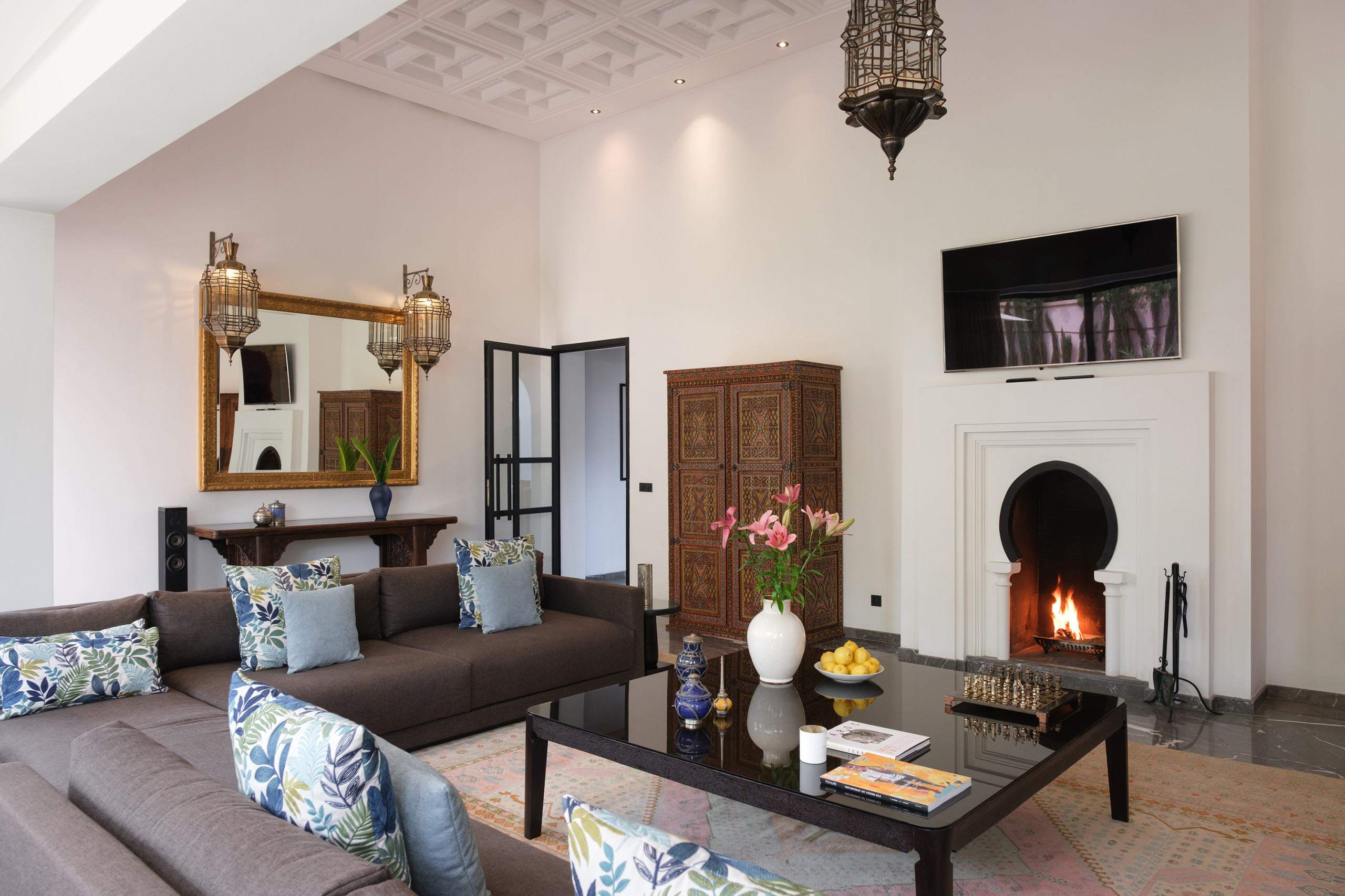 Le bâtiment principal abrite deux salons : un espace lumineux avec canapés blancs et hauts plafonds, et un second avec cheminée et TV curve. Salle à manger intérieure, coin petit déjeuner, bibliothèque, objets chinés au fil des années — Villa Yasira a tout d’une grande maison de famille.